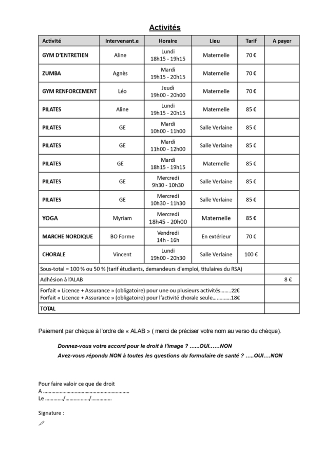 Horaires Gym d'entretien : lundi 18h15-19h15 avec Aline, sauf vacances scolaires